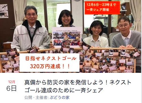 Facebookイベントページ、真備から防災の家を発信しよう!ネクストゴール達成のために一斉シェアに「参加予定」をクリックお願い致します。