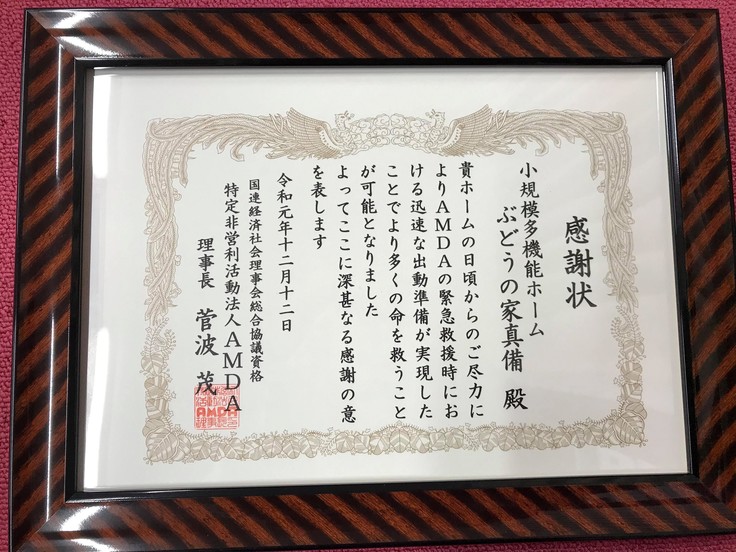 2019年12月12日 AMDAさんから、縫い真備チームが感謝状をいただきました。