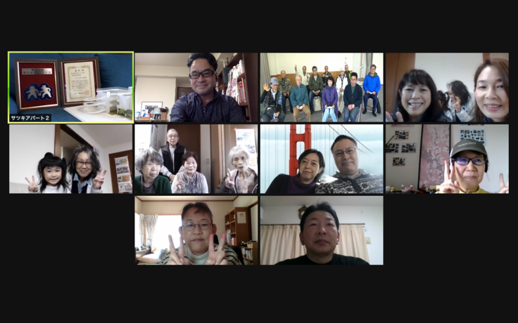 サツキアパート(自然とこの愛称で呼ばれています。)、箭田分館、広島や東京の自宅などからも参加してくださり、総勢25名での記念撮影となりました。オンラインではありましたが1年以上お会いしていない方々にもお会いできました。