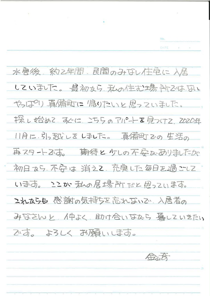 高齢の入居者のことを気にかけて見守ってくださったり、町にお勤めなのでお買い物をして来てくださったりと、私はとても頼りにしています。お願いすることばかりで、申し訳ないのですが、いつも「大丈夫ですよ」と優しく仰ってくださいます。金崎さんには、いつも感謝しています。