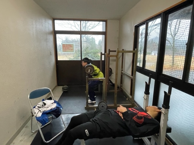 新入生も雪上練習に備え、先輩から筋トレを教えてもらっています。