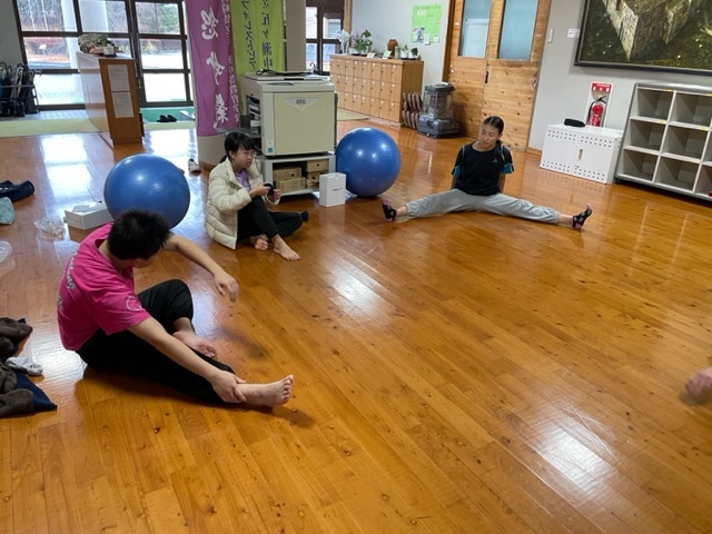 柔軟も行いながら、バランスボールも利用して体幹を鍛えています。