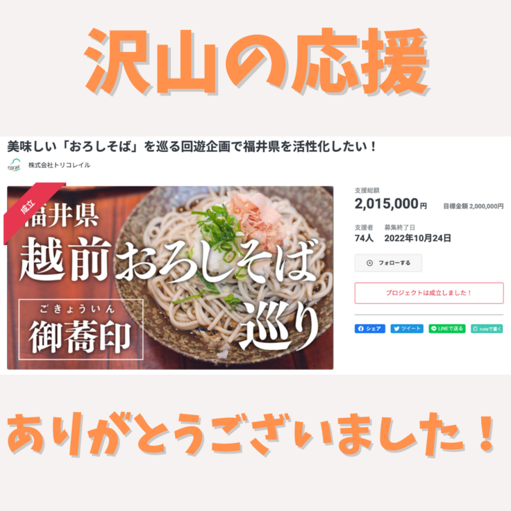 24日23時で締切となりました御蕎印(ごきょういん)巡りのクラウドファンディングは、皆様の多大なる応援、支援のおかげさまで目標金額であった200万円を達成することが出来ました。