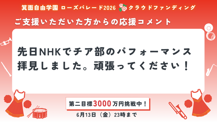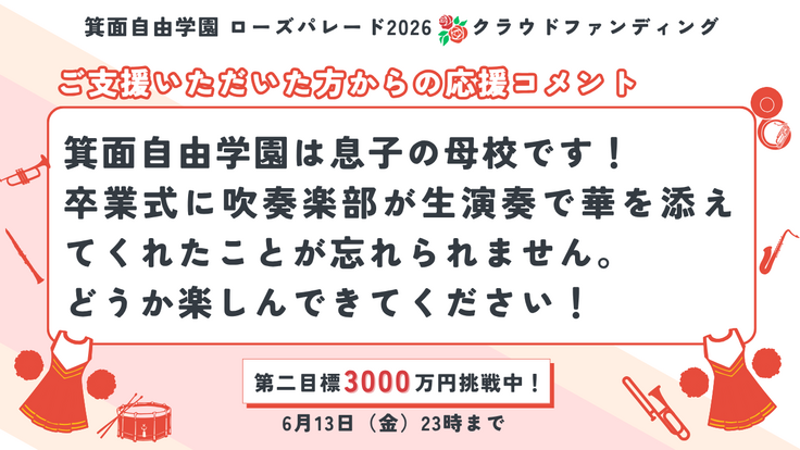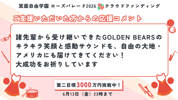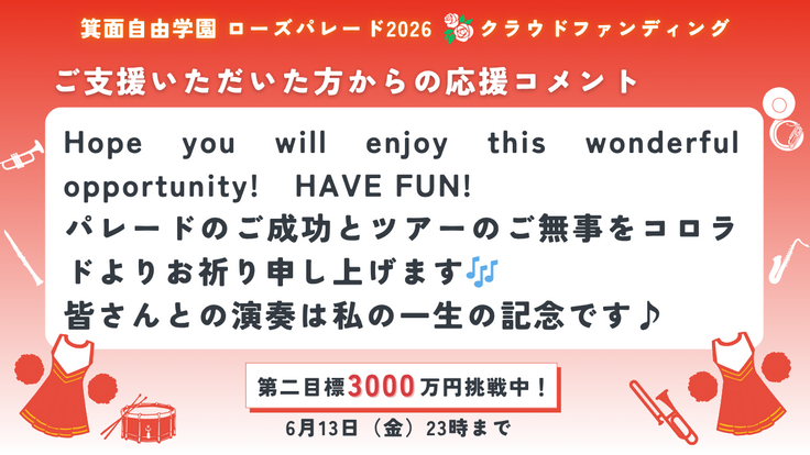 ■資金使途:箕面自由学園高等学校 吹奏楽部・チアリーダー部のローズパレード2026出場遠征費の一部