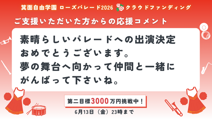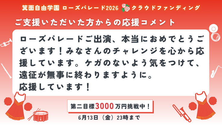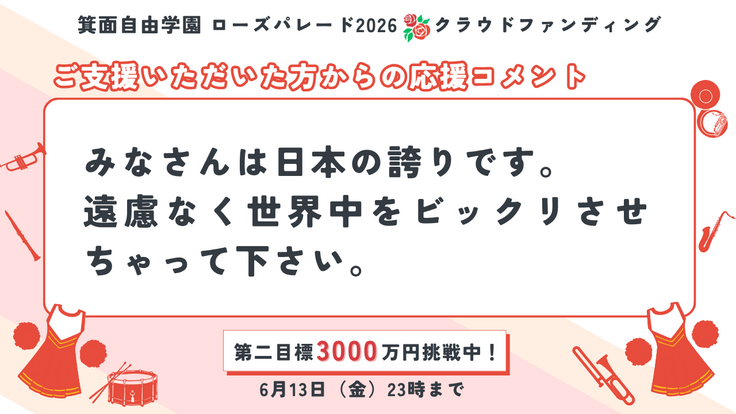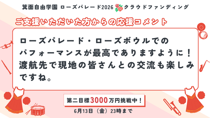 ■資金使途:箕面自由学園高等学校 吹奏楽部・チアリーダー部のローズパレード2026出場遠征費の一部