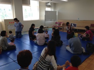小さなあかちゃんもお母さんの膝の上でお話を聞いていたり、あかちゃん同士でおしゃべりをしたり~わらべうたでは、あかちゃんはお母さんやお父さんやおばあちゃんが、少し大きな子は自分で、節に合わせてお顔を触ったりして楽しんでくれました。