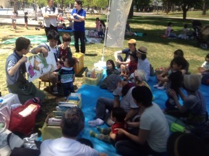 当日は朝から天候に恵まれ、スタートから持参した5メートル四方のシートがすぐにうまる状況に。絵本の読みきかせなどのおはなし会は、午前と午後の2回おこない、前後の時間は「ピクニックタイム」として、ランチなどをしながら自由に絵本を楽しむ時間としました。