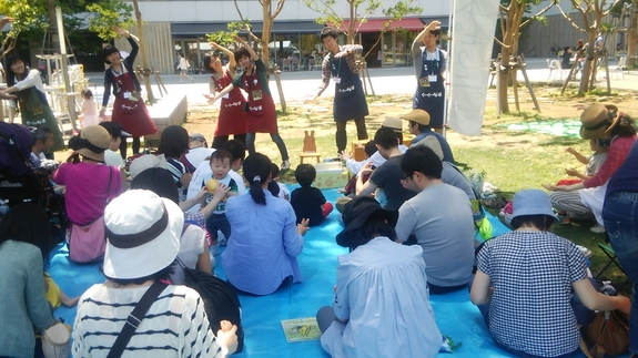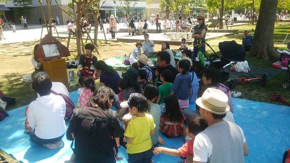 たまたま居合わせた方も、みんなが一緒に童心にかえって楽しめるのが、野外のおはなし会の良いところ!時間が進むごとに、広い公園に一体感が生まれます。