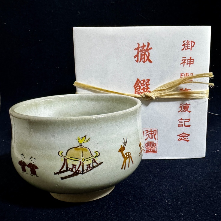 この記念湯呑には、御霊神社のお神輿や春日造の御本殿、願掛けの狛犬、御幌に描かれた鳳凰と桐、さらには御神木の黒松などが奈良絵として描かれています。
