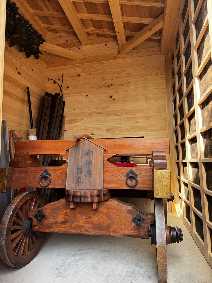 これまでは神輿と台車を別々に保管しておりましたが、台車を収めていた建物の屋根を高くしたことで、神輿を台車に据えたまま保管することが可能となりました。これにより、神輿の乗せ下ろしにかかる負担が減り、人手の確保が必要だった作業も軽減されるとともに、神輿への傷みも防ぐことができます。
