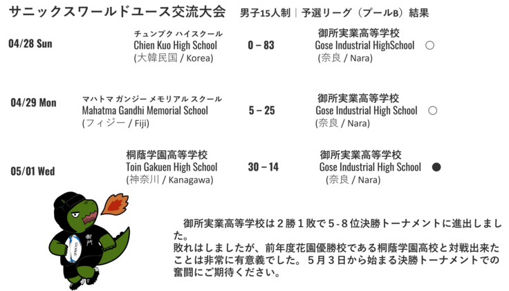 皆様のご支援とあたたかい応援メッセージありがとうございます。現在出場中のサニックスワールドユース交流大会の続報です。本日5月3日からは、決勝トーナメント始まります。皆さんと一緒に応援したいと思います。頑張れ御所実ラグビー部!!