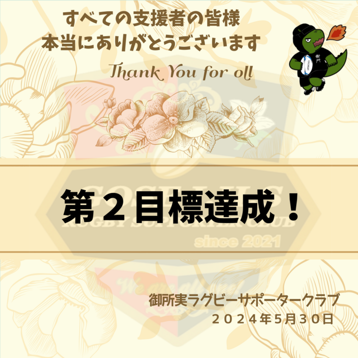 今年度の御所実ラグビー部は、発足時から好成績を収めており、今年度中の夢達成も現実味をおびてきていると感じています。ご支援いただいた皆さんのお力を糧に、秋には更に成長した部員たちの姿をご披露できると確信しております。今後とも応援よろしくお願い致します。