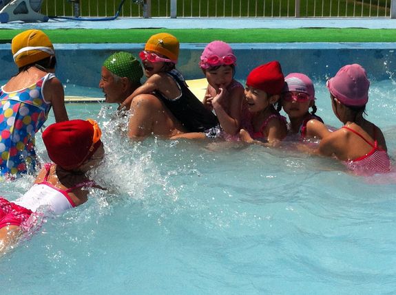 その結果、8月7日(火)、夏休みの預かり保育の園児を対象に、柴宮幼稚園の屋上プールでプールびらきが行われ、およそ80人が、午前10時からプールに入りました。(40人×2回に分けて入りました。)