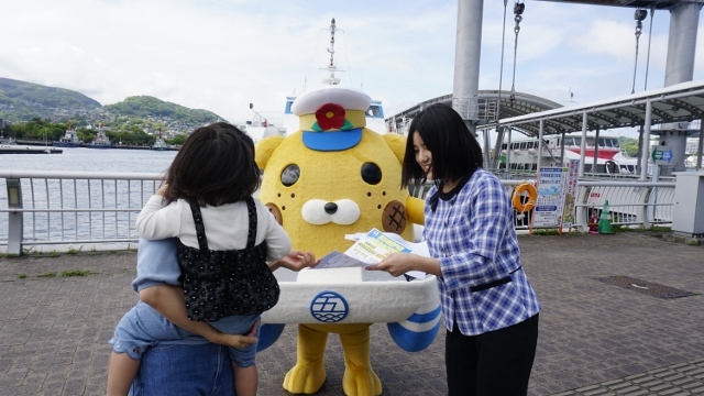 かんころポチと従業員による長崎港ターミナルでの広報活動。
