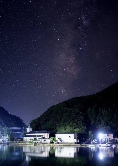 中ノ浦教会と水辺に反射する教会 空に広がる天の川