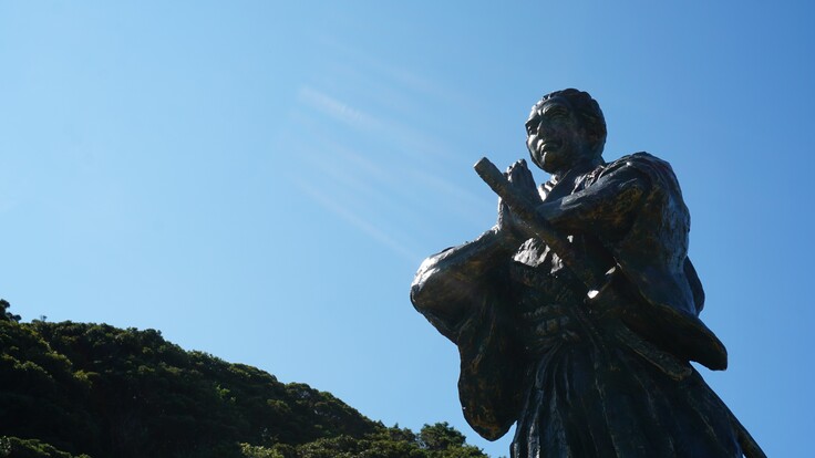 海上で遭難した仲間への鎮魂の気持ちで合掌する竜馬像(坂本竜馬ゆかりの広場)