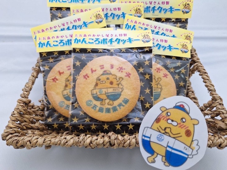 五島産業汽船㈱公式マスコットキャラクター「かんころポチ」をプリントしたかわいいクッキー。島内のお菓子屋さんにご協力いただき完成した力作!