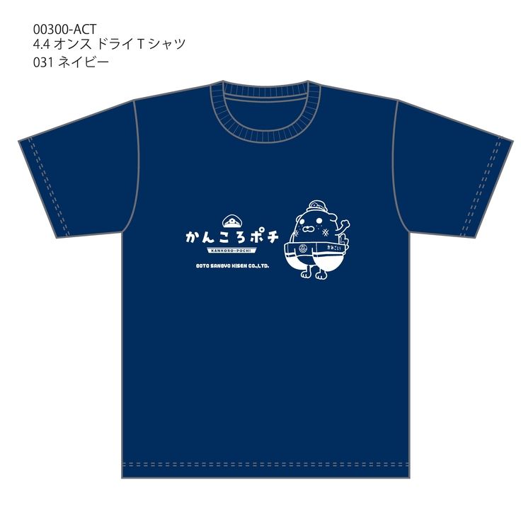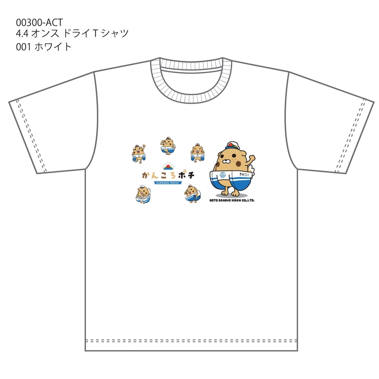 Tシャツカラーは白で、前面にかんころポチのイラストをカラープリントしています。かんころポチの基本ポーズに、かわいい5ポーズを追加しました。
