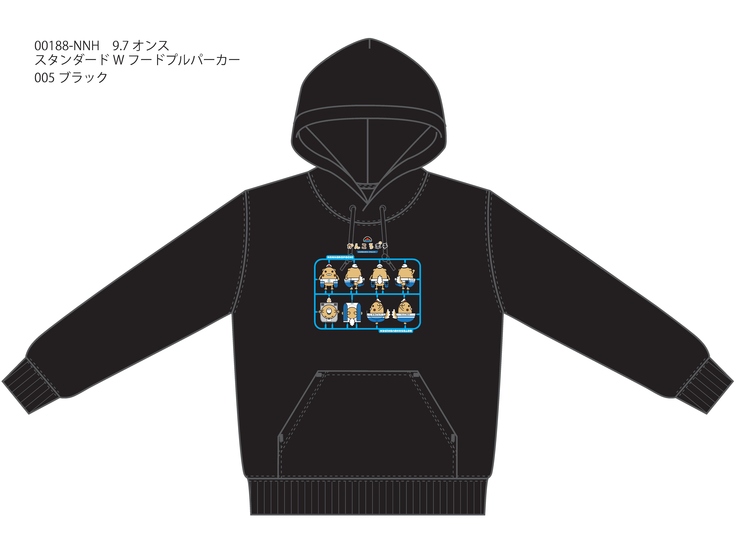 パーカー自体のカラーはブラックで、かんころポチがプラモデルの部品のようになったデザインでプリントはカラーです。