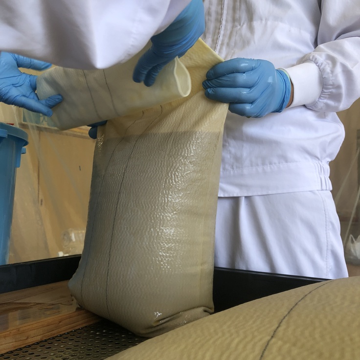 今回は発酵の終わった魚醤たちを、絞り袋に入れて絞っていく様子です。