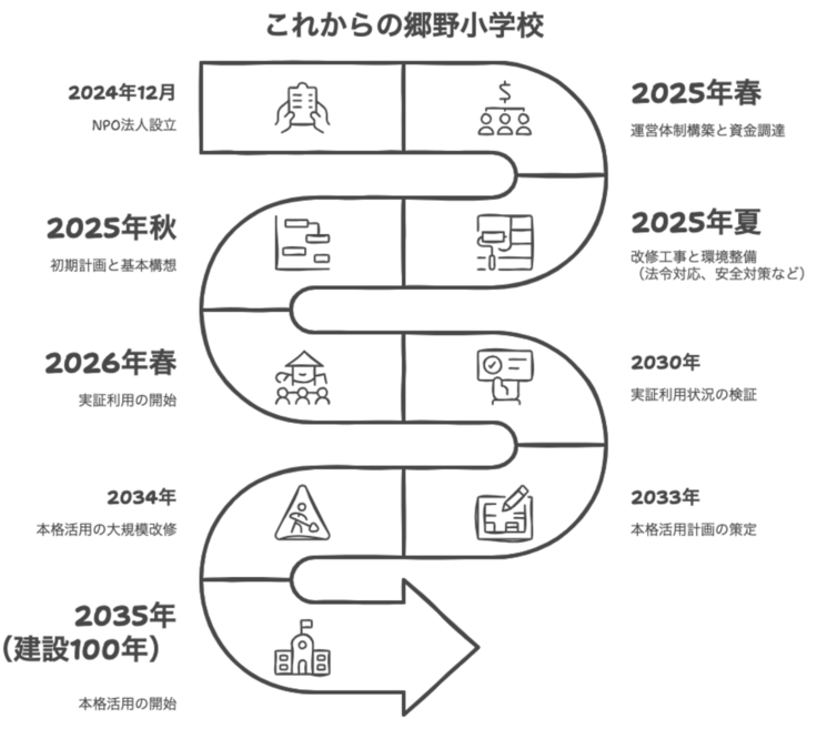 2035年までの10年間を「実証利活用フェーズ」と位置づけ、様々な活用方法を試しながら、この場所にとって最適な未来の形を探っていきます。郷野小学校の再生を通じて、全国で増え続ける統廃合校舎の新たな活用モデルを示したい—そんな大きな夢を抱いています。 この歴史と思い出が詰まった郷野小学校に、生まれ変わるチャンスをください。皆さまの温かいご支援が、100年の歴史を次の100年へとつなぐ架け橋となります。