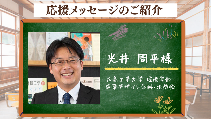 今回は、本プロジェクトに寄せていただいた、建築デザインの専門家である光井周平様(広島工業大学 環境学部 建築デザイン学科・准教授)からの力強い応援メッセージをご紹介させていただきます。