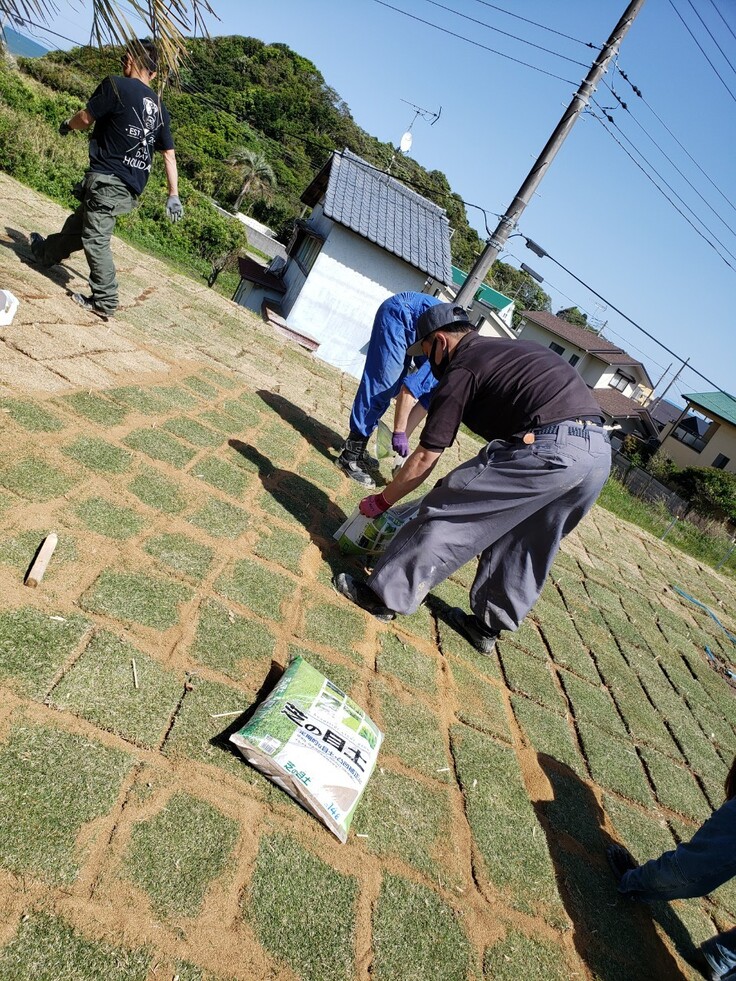 何もなかった更地に大きなヤシの木が一本植わるだけで、ガラリと雰囲気を作ってくれましたが、更にみんながいい時間を過ごせるように、全面に芝張りも同時進行で行なっています!