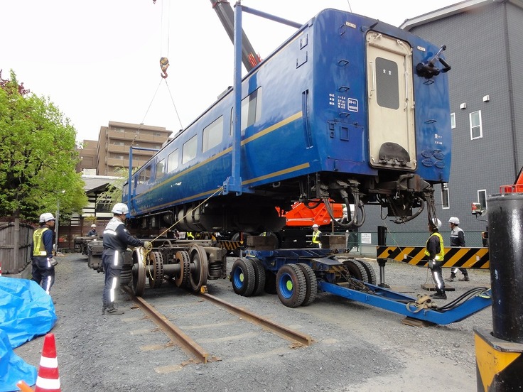 車輛所定の場所まで移動し、牽引トレーラーから外されたのが深夜3時近く。数時間後の朝からいよいよクレーン作業が開始されました。