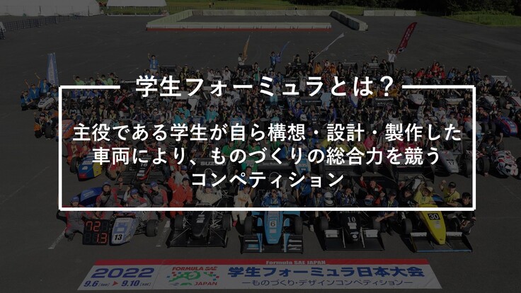 大学生のみが参加するこのチームは、フォーミュラレーシングカーを1から設計・製作し、毎年行われる学生フォーミュラ日本大会に出場しています。