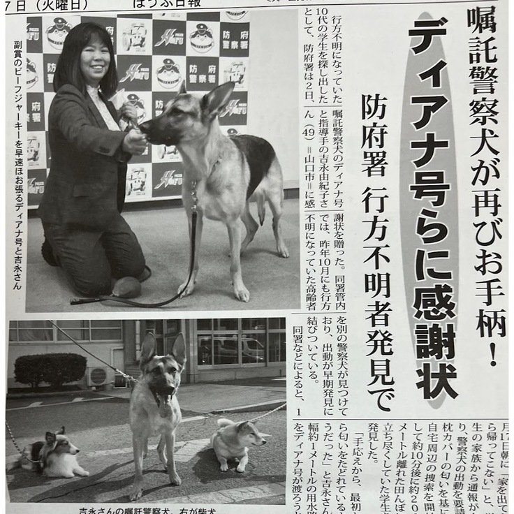 一昨年(2023年8月)、社会貢献活動を事業理念とするメンバーの集まり(都内)の中で、吉永さんにお会いして、警察嘱託犬の活動を知り、同年12月に開催した世田谷事件の集会(都内)に参加して頂き、返礼のような形で翌年(2024年6月27日)「山口県警察嘱託警察犬競技会」に参加させて頂き、県警との対談の中で吉永さんの功績を具体的に伺いました。
