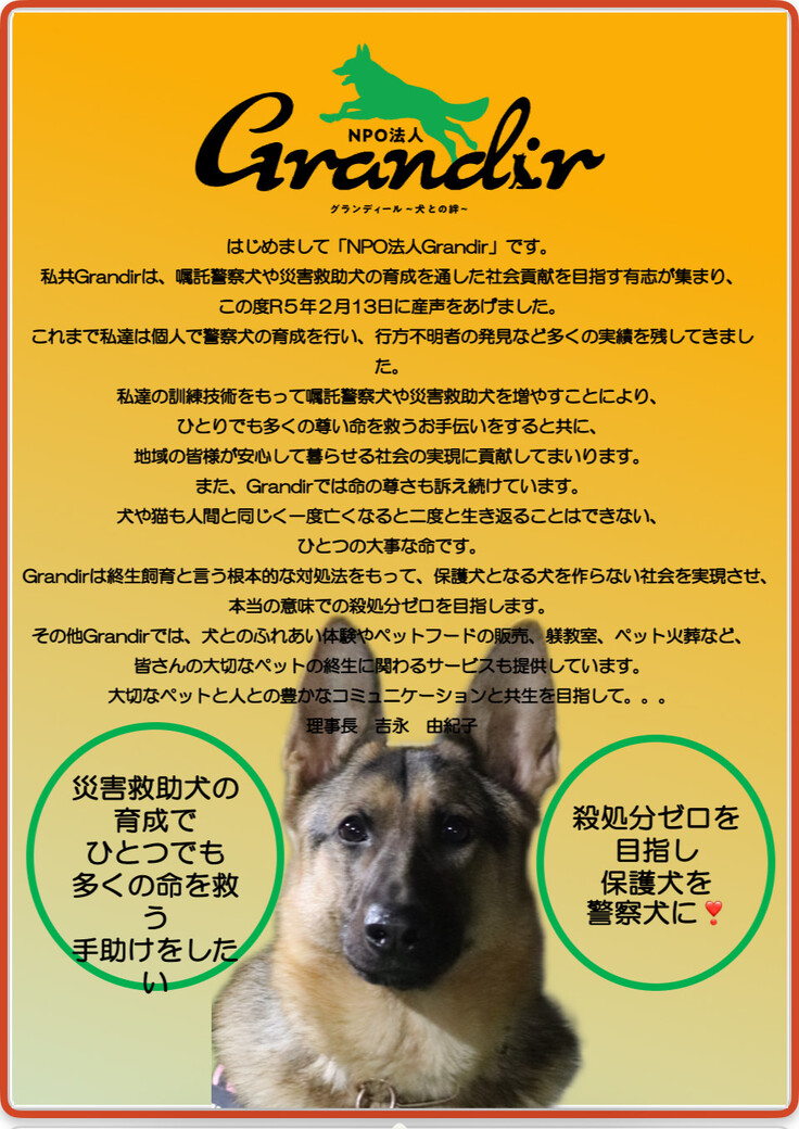 私たちGrandir(グランディール)は、殺処分ゼロの実現を目指して、保護犬・保護猫のケア、そして嘱託警察犬・災害救助犬などの使役犬の育成にも取り組む非営利団体です。