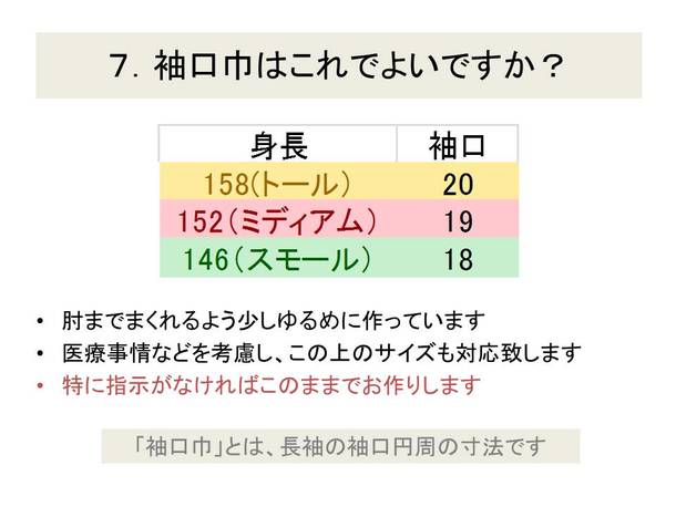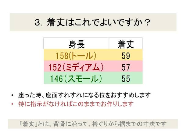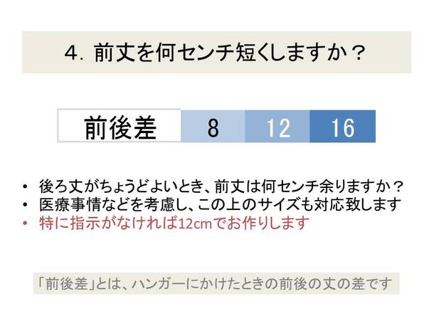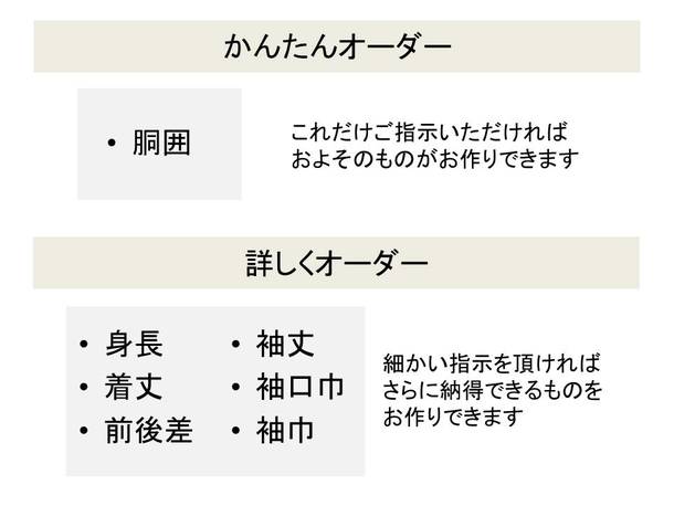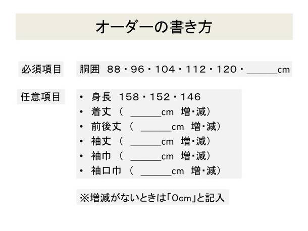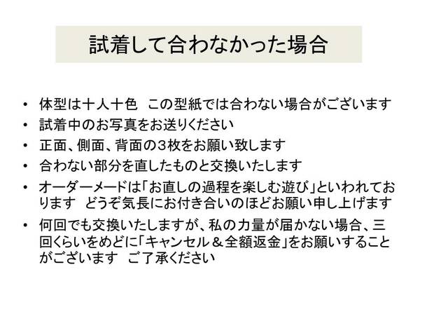 お願いなのですが、このオーダーフォームで改めて注文してみていただけないでしょうか。直接ご本人のサイズを計ることで、私の目の届かないところを補い、ご本人の本当に欲しいと思っているサイズを知ることが出来ます。お手数ですがどうぞよろしくお願い致します。また、季節が季節ですので、生地の変更も承ります。お好きな生地をお選びください。