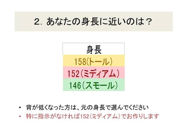 生地と色を選び、胴囲と身長を選び、空欄を埋めて下さい。