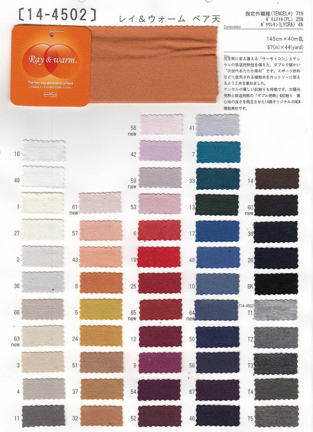 テンセルの優しい肌触りも特徴です。太陽光発熱と吸湿発熱の「ダブル発熱」&肌触り・着心地の良さを両立させた14課オリジナルのNEW機能素材です。