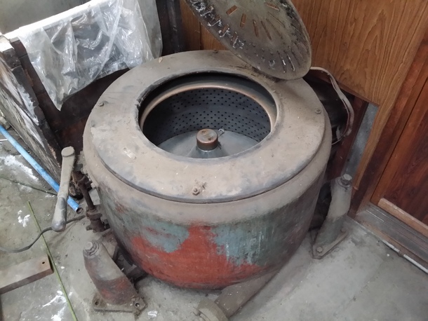 生糸を脱水する専用の遠心分離機。余りの重さに一度は運搬を断念しましたが、蓋と脱水槽を外し、プーリーを抜き、何とか運び出しました。