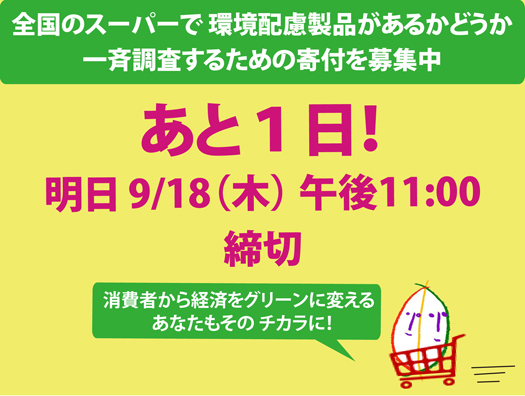 スーパーの環境を大切にした商品の取り扱い状況や環境の取り組みを調べる「全国一斉グリーンコンシューマー調査」を行なうための寄付募集も残すところあと1日となりました! もしかしたらみなさんが見るタイミングによっては24時間を切っているかもしれませんね。
