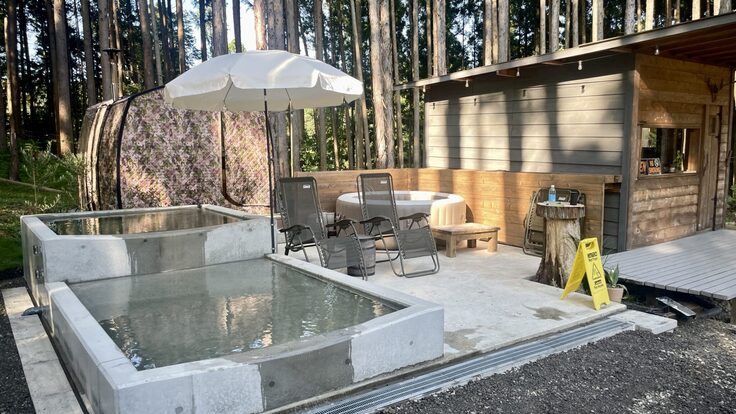 広いスペースはもちろん、焼き台、冷蔵庫、温水シャワーさらに薪ストーブのサウナに水風呂もございます!