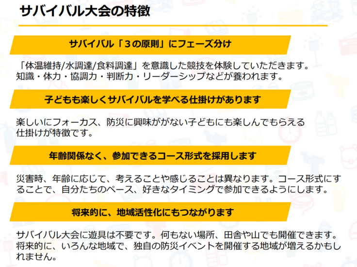 内容:”遊ぶ”感覚を取り入れつつ、防災サバイバルを学べる仕掛けづくり