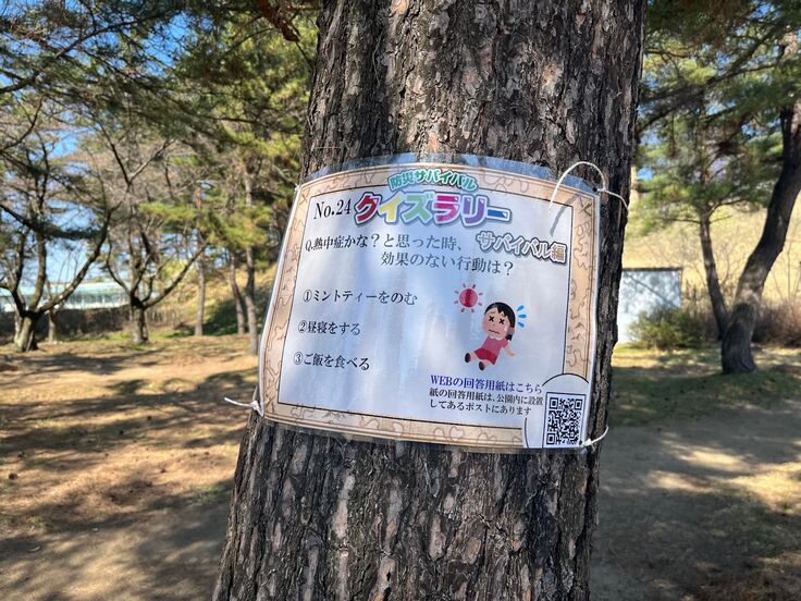山・海川・サバイバル・防災の4分野に分け、毎月1回クイズを移動させ、一つの公園でも全分野の問題を解けるように、いたしました。