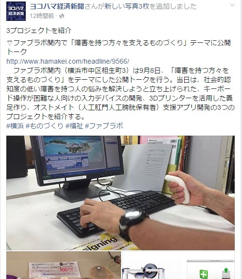 ファブラボ関内(横浜市中区相生町3)は9月8日19時、「障害を持つ方々を支えるものづくり」をテーマにした公開トークを行う。当日は、社会的認知度の低い障害を持つ人の悩みを解決しようと立ち上げられた、キーボード操作が困難な人向けの入力デバイスの開発、3Dプリンターを活用した義足作り、オストメイト(人工肛門人工膀胱保有者)支援アプリ開発の3つのプロジェクトを紹介する。