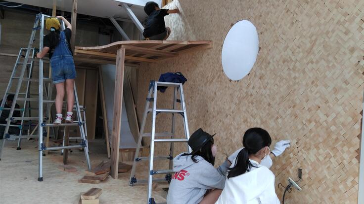 みんなで協力して3cmの木のチップを敷き詰めて作った床に、なんと滑り台が設置されました。