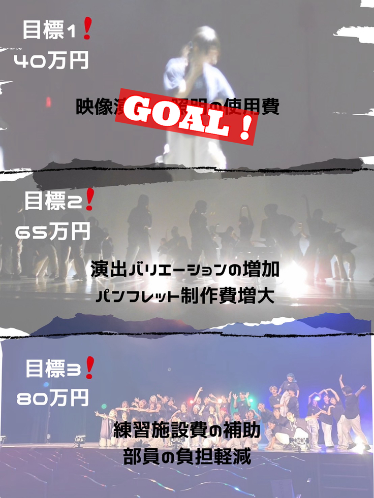 そして、さらなる挑戦としてネクストゴール 650,000円 に挑戦いたします!ネクストゴールの使い道としましては、①演出のバリエーション増加②パンフレット製作の予算増大③練習施設費の補助の3点を考えております。