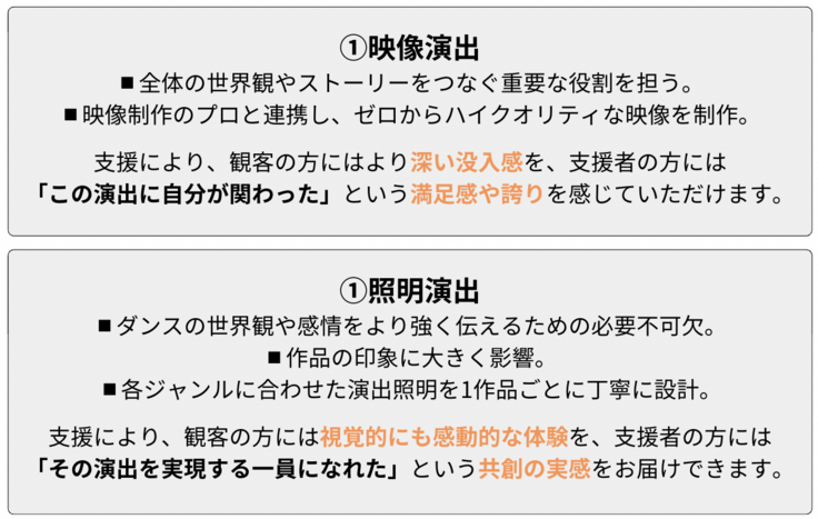 ご支援いただいた資金はすべて、公演のクオリティ向上と、より多くの方に感動を届けるために活用させていただきます。また、「この演出を支えたのは自分だ」と感じていただけるような、特別な関わり方、お礼の品をご用意しております。