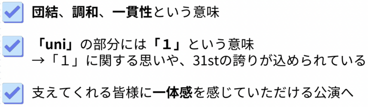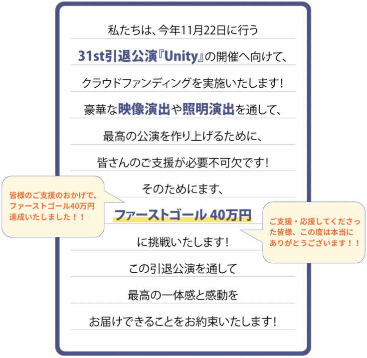 31st引退公演という最後のステージが、私たちの「Unity」を最大限に体現する場所になるよう、最高の仲間たちと共に心を込めて踊りきります。