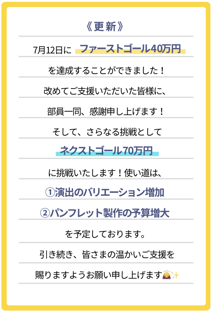 また、引退公演には演出費用に加え、会場費や練習施設費等、多くの費用が必要です。しかし、サークル費や自主イベントの収益だけではまかないきれず、皆様のお力が必要不可欠です。