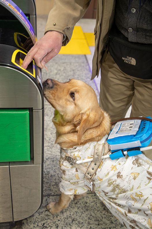 こちらの写真では盲導犬が鼻先で自動改札の切符の投入口を指しています。