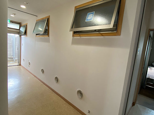 犬舎の扉と廊下から外に出る扉、そしてこの5つの窓の開閉を組み合わせることで、様々な通気のパターンが可能になっています。