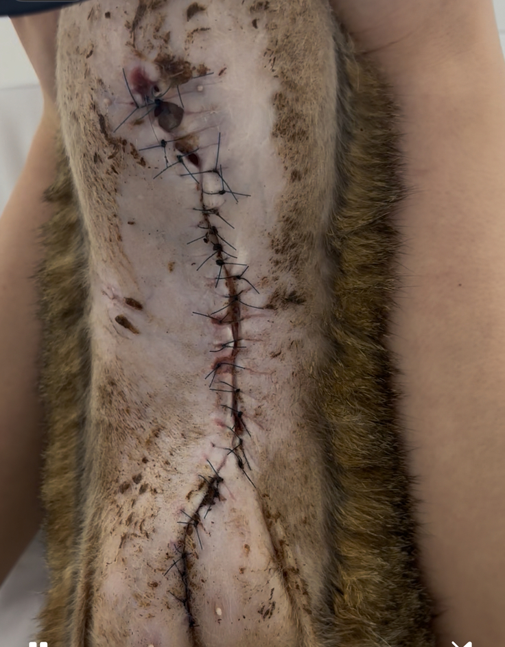 それでもグラは命をつなぎ、懸命にがんばってくれました。 その後も膵液が止まらず、膵臓から出る膵液の影響で、手術で縫った部分の糸が溶けてしまい、腸が外に出てしまう事態になり、膵液を抜くためにドレーン(管)を入れる手術。