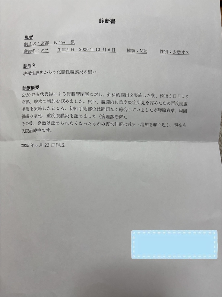 ところがグラの熱は下がらず、CT検査の結果「膵臓に異常がある」とわかり、再び緊急手術。 壊死性膵炎でした。