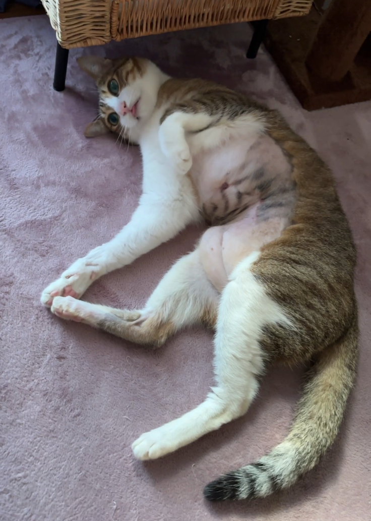 お腹の縫ったところは抜糸したのですが皮膚が弱くなっているためくっつかないところが1箇所、まだ穴が空いてます。